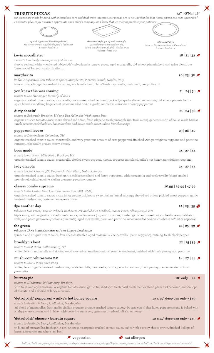 When it comes to the menu, Tribute Pizza doesn't hold back. Their specialty pies are a tribute to the pizza legends and the art of pizza-making itself. Dive into the classic Margherita—a homage to Queen Margherita crafted with bianco dinapoli organic crushed tomatoes, aged mozzarella, and fresh basil that sings in every bite. Or savor the Kevin McCallister, where each slice is layered with a nostalgic blend of sauce, mozzarella, and a special herb mix—perfect for anyone craving that quintessential pizzeria taste.