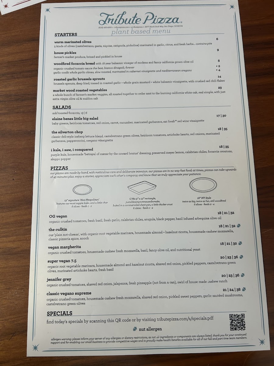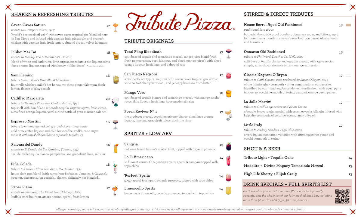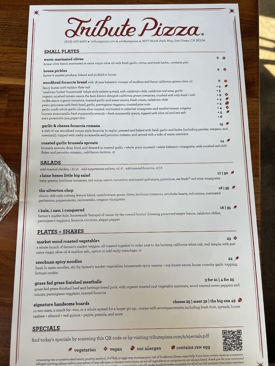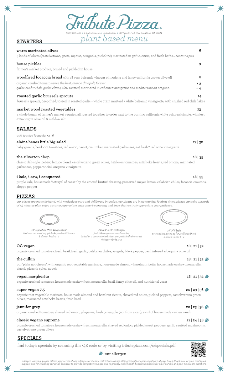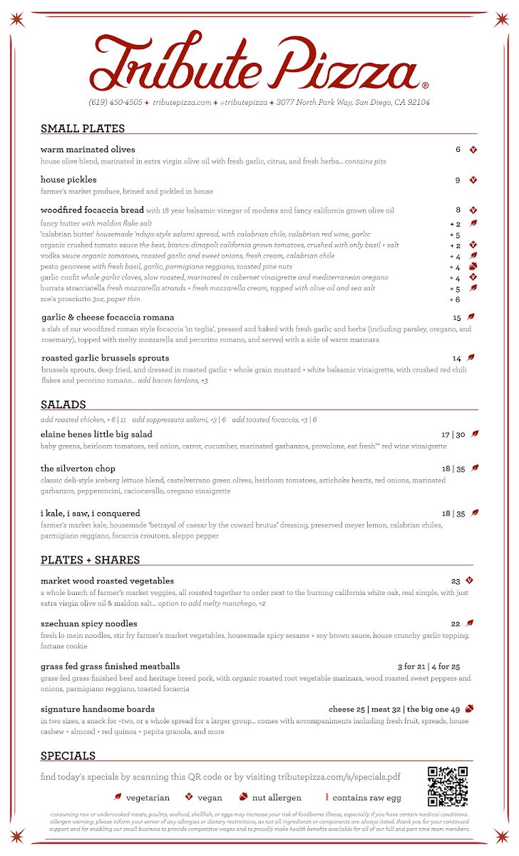 Welcome to Tribute Pizza, an exceptional pizza haven nestled in the heart of San Diego at 3077 N Park Way. This vibrant eatery is not just about food; it’s an experience crafted for pizza lovers who appreciate authentic flavors and high-quality ingredients. With a menu that combines classic pizzeria charm with innovative twists, Tribute Pizza transports you to Italy without ever leaving California.